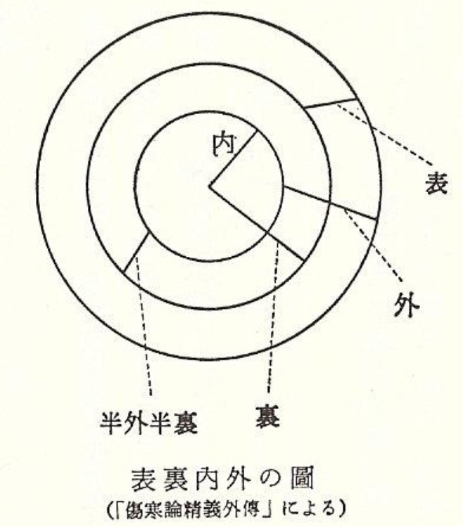 일본의 상한론 연구에 큰 업적을 남긴 오츠가 케이세츠(大塚敬節, Ōtsuka Keisetsu,1900-1980)는 육경병을 表裏로 보았을 때 表는 태양이고 裏는 양명과 삼음이며, 內外로 보았을 때 外는 삼양이고 內는 삼음이며, 外와 裏가 중복되는 영역이 소양의 半表半裏라고 하였다.